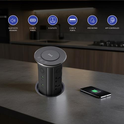Revolutionize your workspace or kitchen with this multifunction power socket, combining advanced power delivery with smart audio capabilities. The unit features 6 Multisockets outlets, along with 2 USB-A port and 2 USB-C port, providing ample connections for all your devices. The top surface boasts an IP65 waterproof tempered glass panel and a built-in 15W QI wireless charging board that offers charging three times faster than similar sockets, compatible with all Qi-standard devices. Enhancing its utility, a separate LED lamp group offers three lighting modes, transforming the unit into an efficient desk lamp. Beyond power, this device is equipped with a high-quality speaker function, utilizing an advanced digital audio processor, double precision stereo drivers, and a bass radiator to deliver rich bass, midrange, and clear treble, even at maximum volume, making it the perfect audio companion for kitchens and offices with a reliable connection up to 100 unobstructed feet away. Experience true smart home integration with Mobile APP control, allowing you to effortlessly power the unit on/off, retract it up/down, and manage the LED lights directly from your smartphone, ensuring you can control your connected appliances even when you are away.